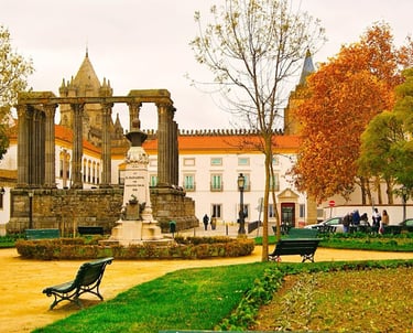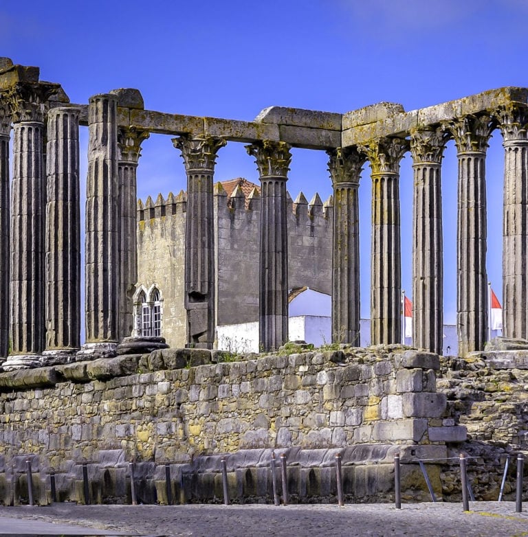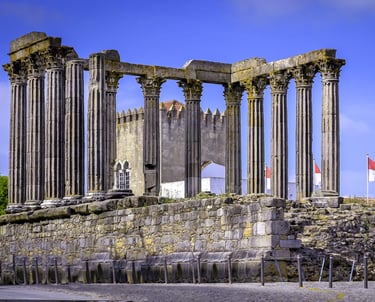 The city, with its narrow streets of Moorish origin contrasting with squares where the light floods in, holds two millennia of hsitory. Conquered in 59 B.C. by the Romans, they named it "Liberalitas Julia". In this period, Évora gained great importance as can be witnessed from the remains of that time: the ruins of a fine temple dated towards the end of the second century, various parts of the wall and the gateway more recently called Dona Isabel in addition to the remains of thermal baths below what is now the Municipal Council building.